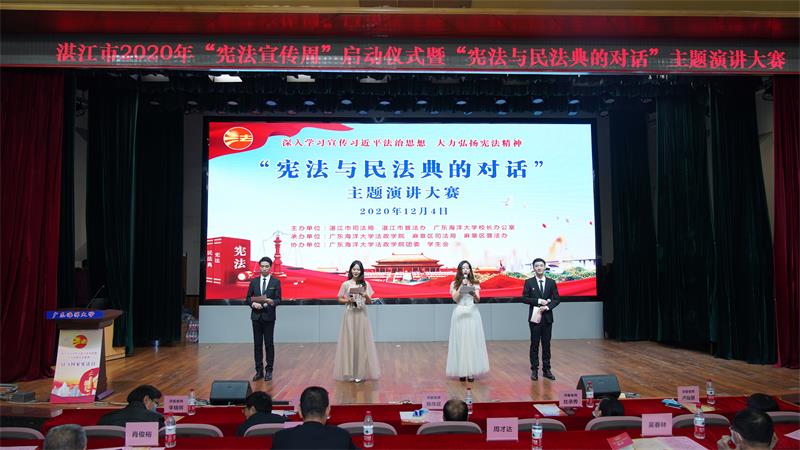 、麻章区司法局、麻章区普法办承办的2020年湛江市“宪法宣传周”启动仪式暨“宪法与民法典的对话”主题演讲大赛活动在广东海洋大学湖光校区多功能厅顺利举行。市政府副秘书长、市信访局党组书记、局长周才达,市司法局二级调研员、市普法办常务副主任李军,市司法局四级调研员、市普法办副主任吴春林、广东海洋大学新葡京app