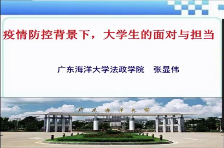 院长张显伟教授以《疫情防控背景下大学生的面对与担当》为主题,结合抗击疫情中的生动事例,对同学们深切寄语:对于自然,要心存敬畏;对于社会,要学会担当;对于国家,要有笃定的信心;对于舆论,要保持理性;对于自己,要从自修之道、基础理论、实践贯通、培养兴趣、积极主动、掌控时间、为人处世等方面努力提升。