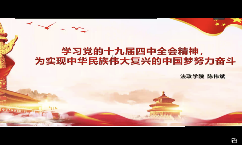 党委书记陈伟斌教授和院长张显伟教授在钉钉平台“云端”开讲,全院学生党员、发展对象、入党积极分子共计400多人次参加,法学专业学生党支部书记卢灿丽主持。