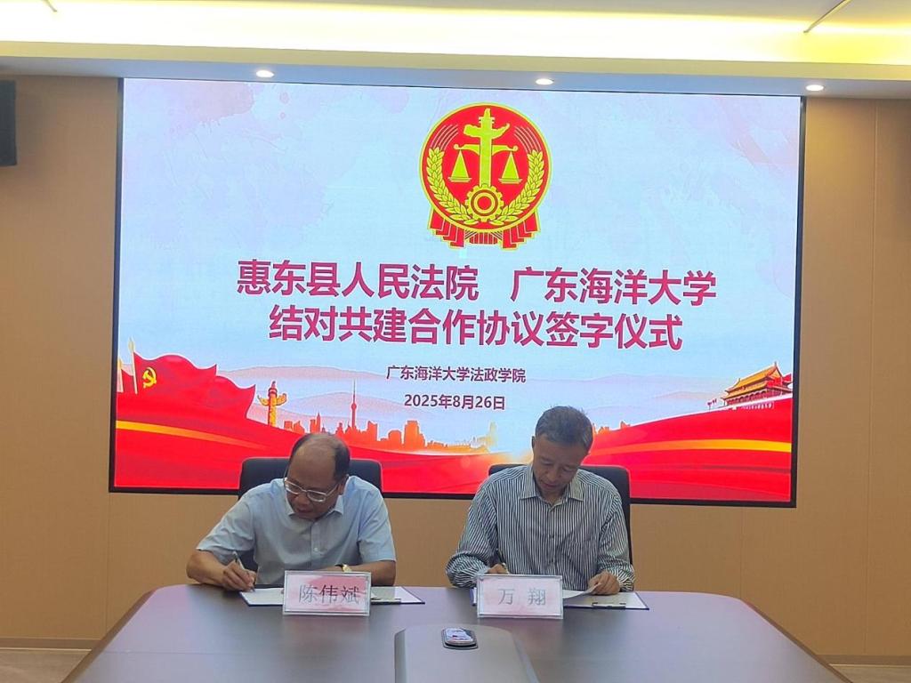 2025年8月26日上午,惠东县人民法院与广东海洋大学签订结对共建合作协议。签订仪式在广东海洋大学文科楼1栋612举行。惠东县人民法院万翔院长、李丽丽副院长、综合办吴镇泽主任、政治部马塨副主任、黄聪一级科员,以及新葡京app