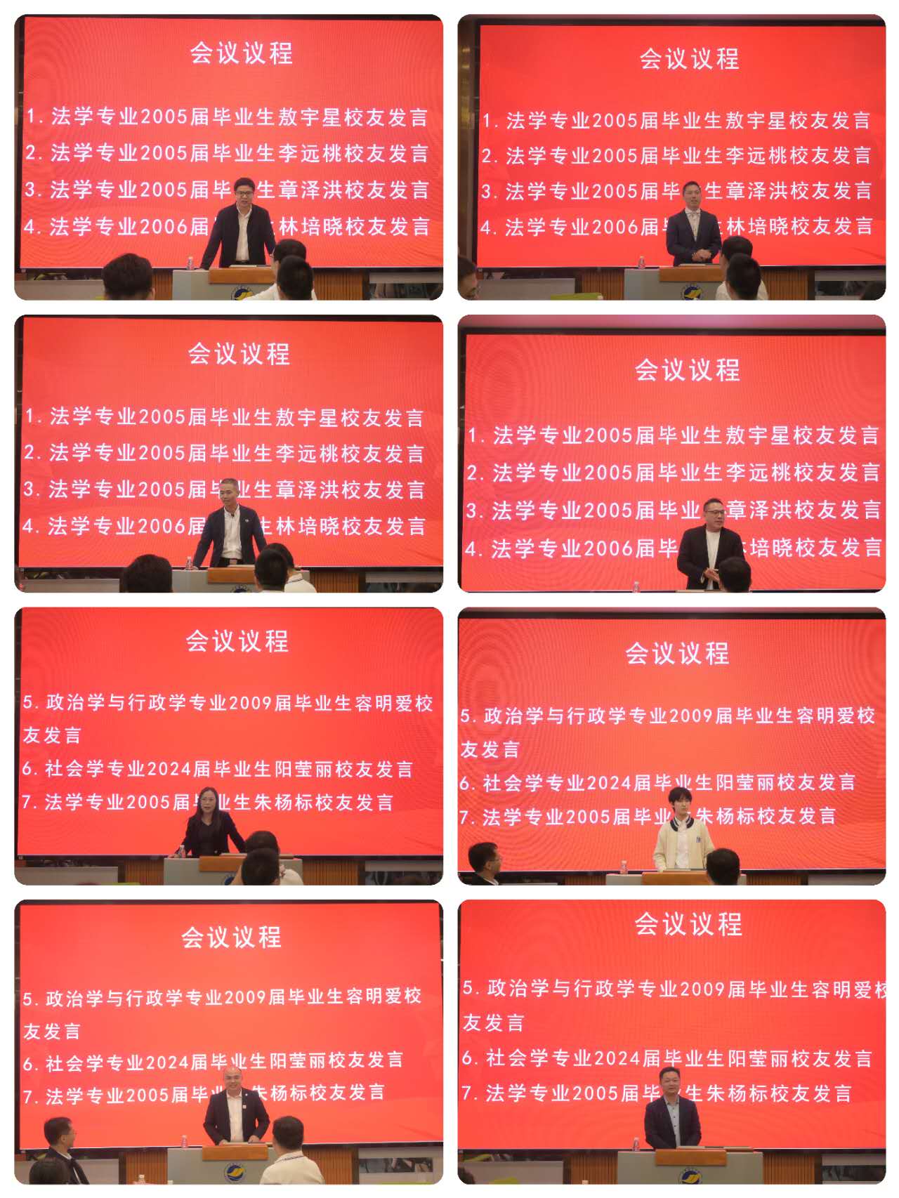 校友代表发言是整场会议的情感与思想高地。八位来自不同年级、不同专业的校友从“在校成长、职场历练、感恩母校”三个维度,讲述了专属于法政人的青春与担当。敖宇星校友回首在校奋斗岁月,以“不惧风雨方得成长”的感悟,呼吁校友们敢于分享失败经历,助力在校生成长。李远桃校友分享从检察官到律师的职业转型故事,以“顺势而为+终身学习”的心得,鼓励在校生通过深造开拓视野。章泽洪校友追忆校园趣事,感念老师对学生的言传身教,直言“校园岁月塑造的价值观,是终身受益的精神底色”。朱杨标校友深情讲述在校求学经历,回忆师生同窗深厚情谊,令在场所有人无不动容。校友林培晓、容明爱、阳莹丽、林金亮也纷纷发言,言语中无不饱含着对恩师栽培的感激、对同窗情谊的珍视以及对母校日新月异发展的自豪。