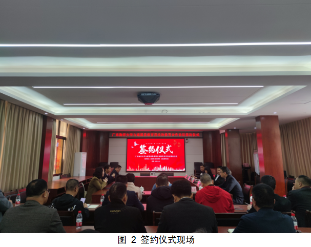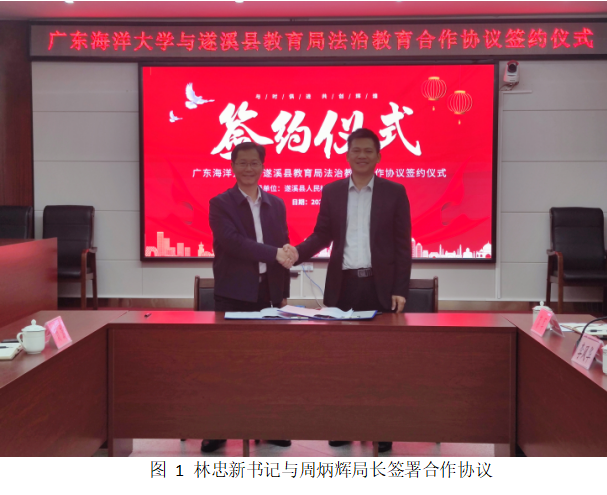 本次签约仪式旨在共同构建法治宣传教育协同机制,充分发挥高校学科专业优势与地方教育系统实践平台作用,提升遂溪县法治教育水平,增强师生法治素养。仪式首先进行了合作协议的签署环节,由林忠新书记与周炳辉局长代表双方签署合作协议。