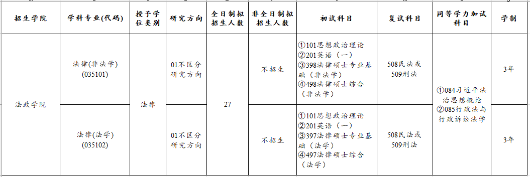 现设有法律(法学)(035102)及法律(非法学)(035101)专业学位硕士点。目前在校全日制专业硕士研究生78人。