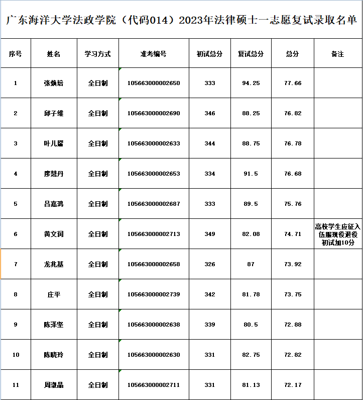 现将2023年硕士研究生招生法律专业考试成绩公示如下。