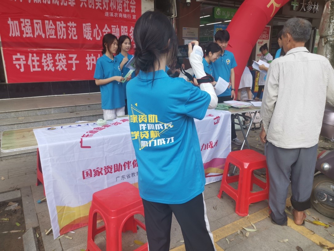 抵达河头镇后,“小星星队”马上在镇上的广东农信银行门口设立了摊位咨询点,通过张贴海报,派发宣传册以及口头宣讲等方式向当地的居民面对面地宣传了国家资助和助学贷款政策的基本内容,并为有需要的居民解答相关疑惑。